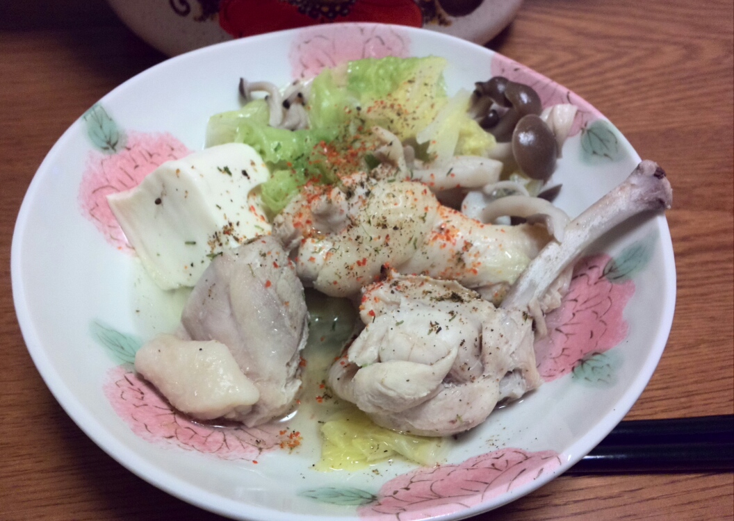 夕飯は冷凍に入れっぱなしだった鶏もも肉と買ってきた手羽元、チューリップを使った白菜鍋。