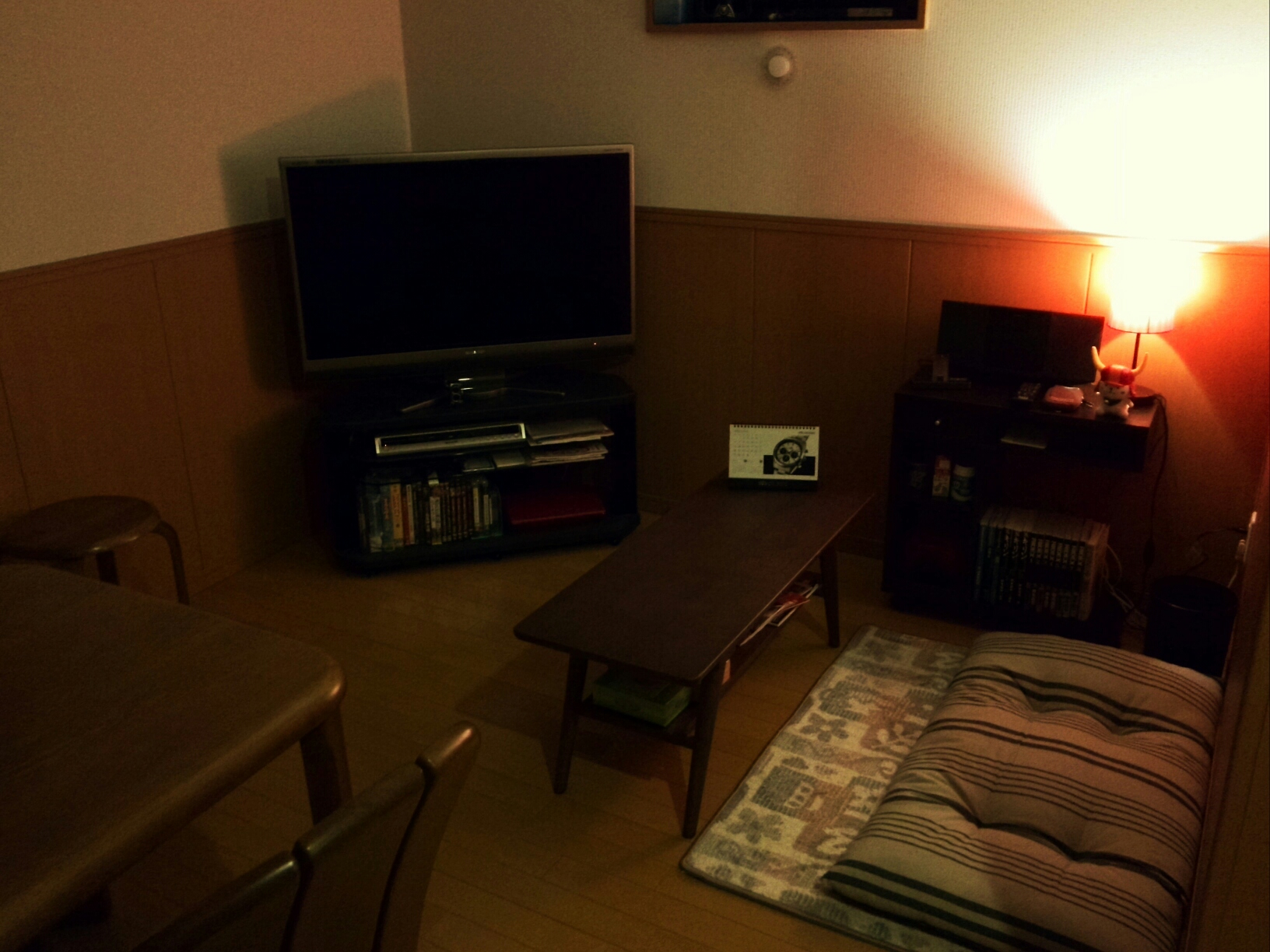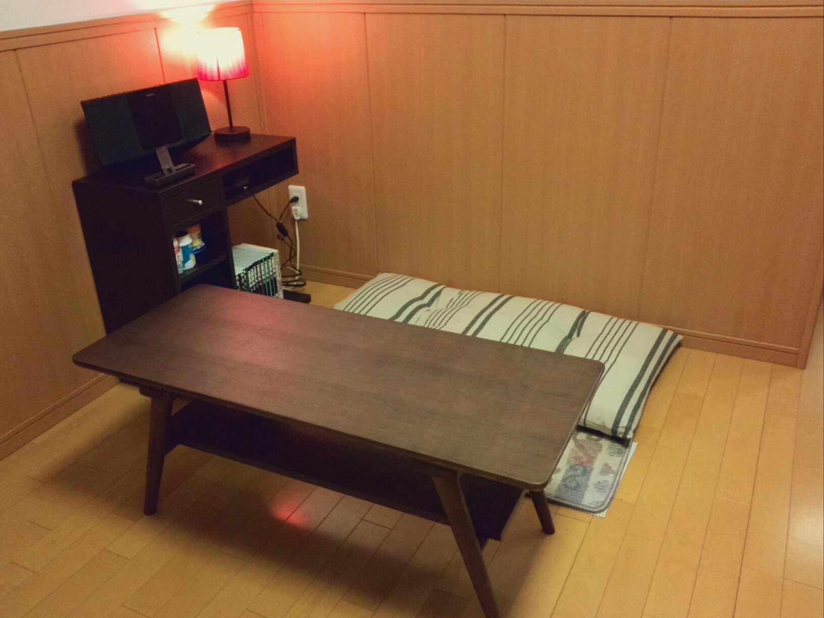 大正堂ではセール品の本革ソファーを注文し、ニトリでセンターテーブルとサイドテーブル、照明と長座布団を買ってきました。