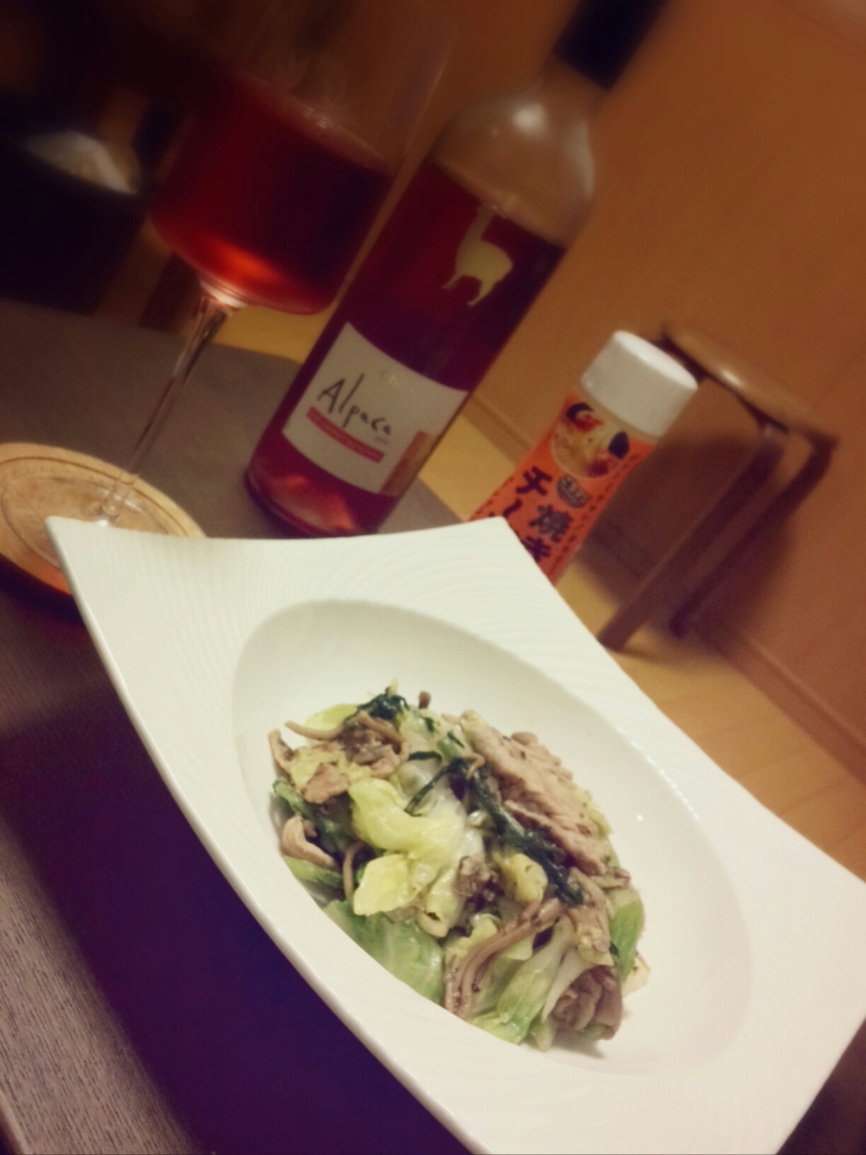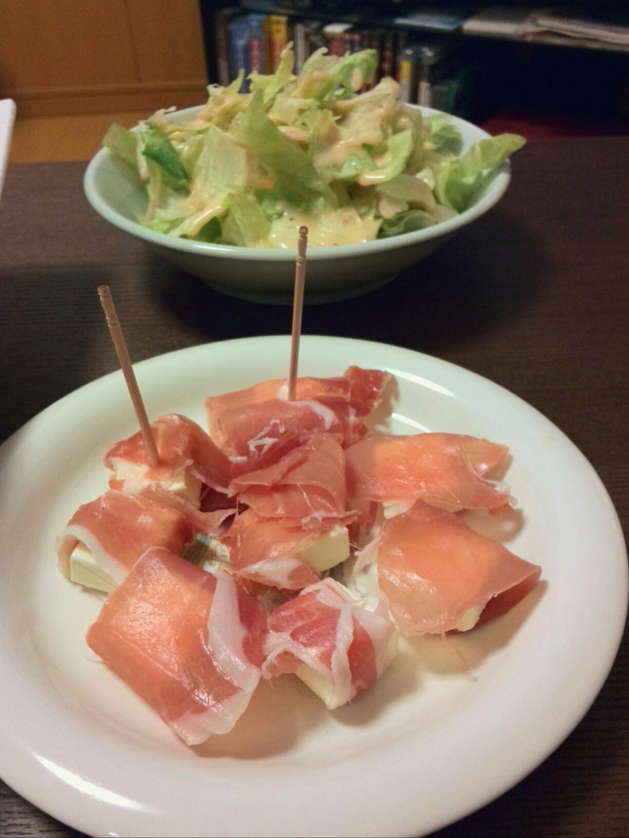 近所のおじさんがまた野菜をくれたので、貰った春菊、買ってきたキャベツ、豚肉、信州で買ってきた茸2種をバターとオリーブオイルで炒めた何か良く分からん物と、生ハムクリームチーズ、サラダ。