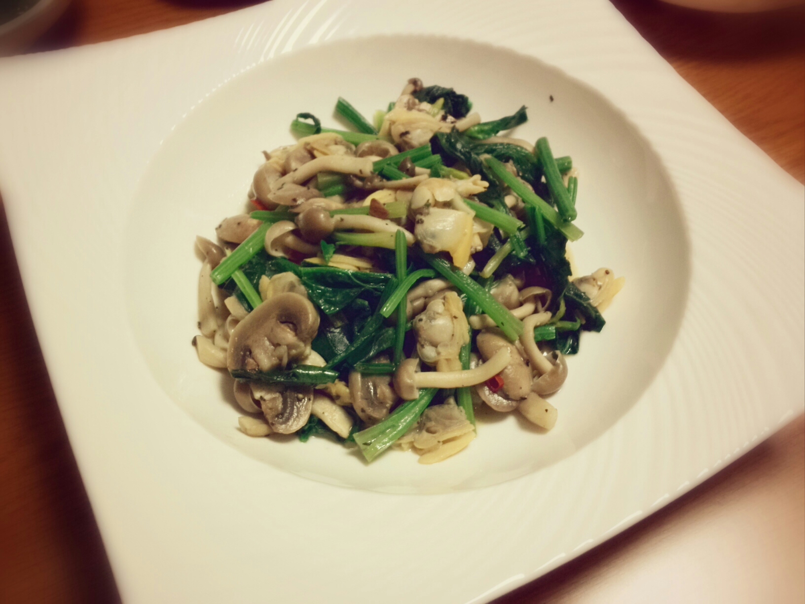 マッシュルーム、ぶなしめじ、ほうれん草、浅蜊のオリーブオイル炒め。