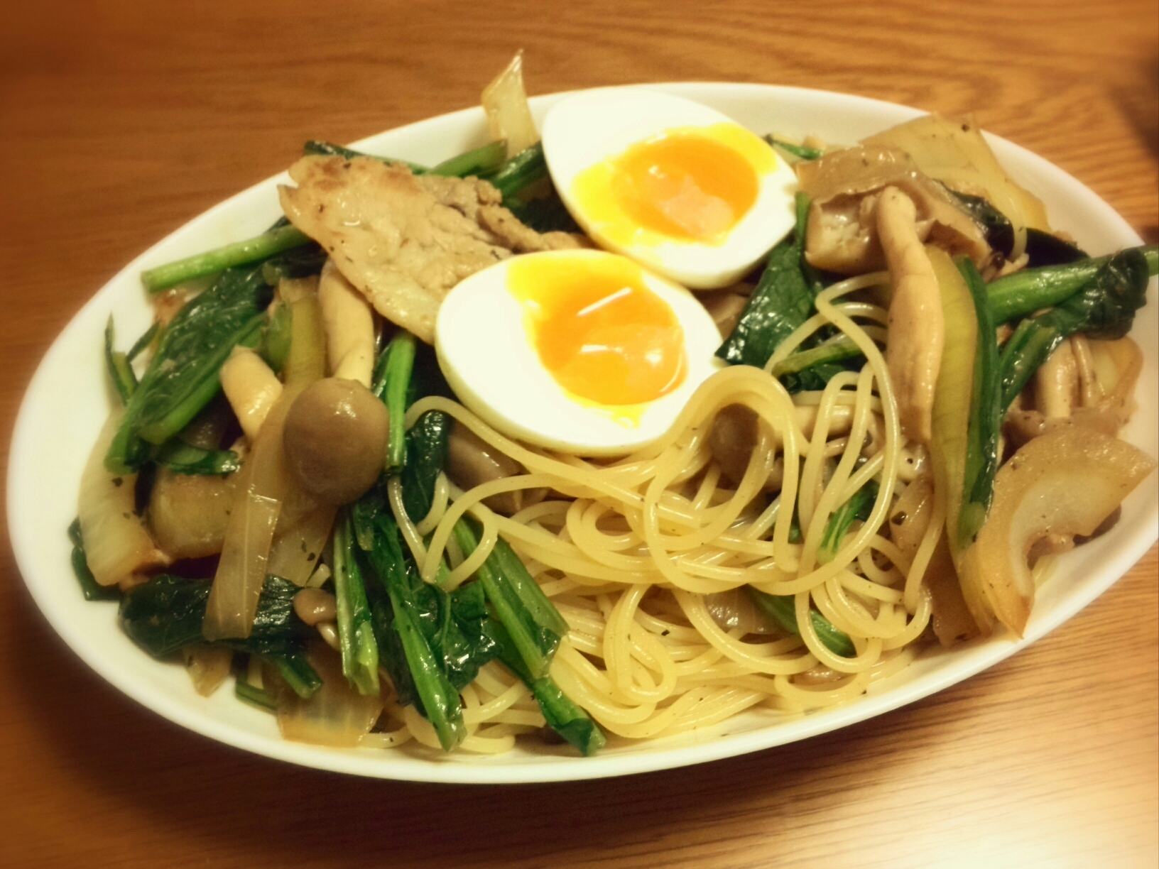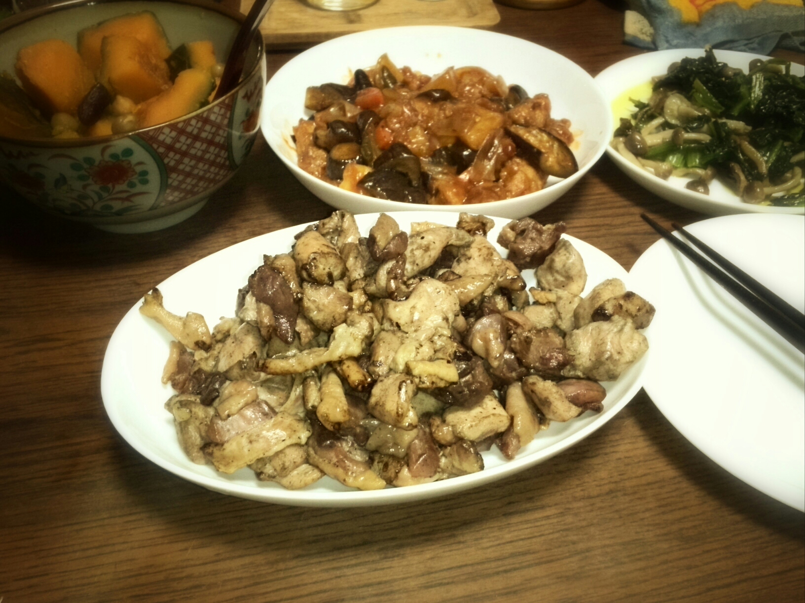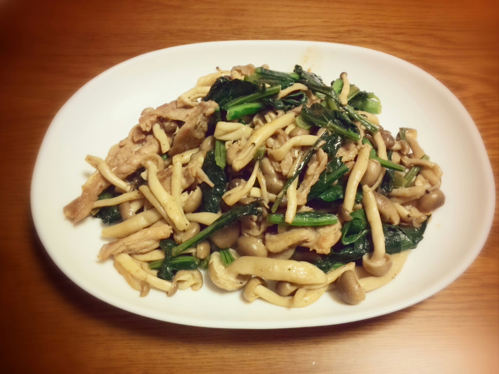 今日はご近所のおじさんから貰った小松菜と買い置きしていたぶなしめじ、冷凍していたせせりを胡麻油、塩胡椒、黄身醤油を作った時の残り醤油で味付けした炒め物。